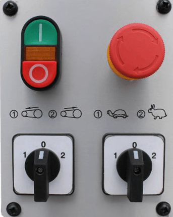 Панель управления - Кнопки включения и выключения станка - Аварийный выключатель - Переключатель направления вращения ленты - Переключатель скорости вращения ленты - 15м/сек и 30м/сек